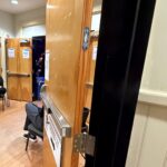 Start with all the extra holes. Looks like the door had a different electric device at one time with the 1″ hole in the bottom of the stop. Add the top strike for the exit device has loose or other than provided screws. At least one of the doors is rubbing the dual egress frame stop. The split in the veneer showing on the top of one door. The gap at the bottom of the doors does not look even. Is it acceptable to add a redundant release button and wire loop to a listed fire exit device? Not a listed wire loop with plastic ends. Are the sex bolts steel or aluminum? The non standard mounting of the door closer. Width issue as posted above. And probably 12 other things I have missed from these photos.