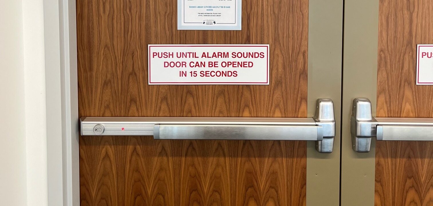 During the recent college visit, I saw the doors below leading from a classroom building to the university library. When the library is open, the doors are held open on magnetic holders to allow access to the library. Because it’s a required means of egress, the doors have delayed egress fire exit hardware (Von Duprin Chexits) to allow code-compliant egress while also deterring access after hours.