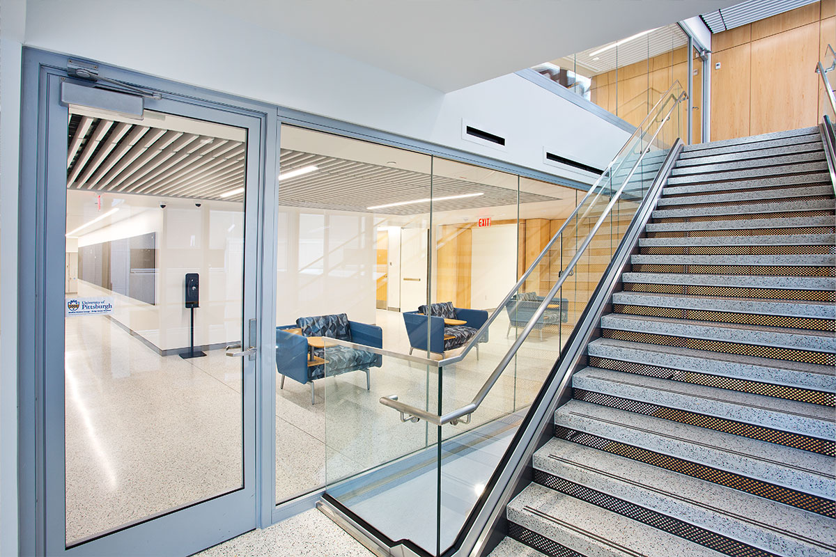 Full-lite fire-rated door assemblies that meet temperature-rise criteria can contribute to designs that prioritize increasing daylight access and improving visual connectivity. When these systems utilize narrow-profile fire-rated frames, they can offer a close visual match to adjacent non-rated assemblies. In fact, the renovation of Alan Magee Scaife Hall at the University of Pittsburgh includes Fireframes® Heat Barrier Series fire-rated doors. These doors increase the glazing area along the building’s central stairwell while the framing profiles create a cohesive design aesthetic between the fire-rated systems and the neighboring, non-rated exterior curtain wall.