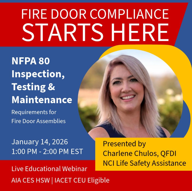 Participants will learn how to apply NFPA 80’s 13-point inspection criteria, understand required inspection frequencies and documentation practices, recognize common deficiencies that impact fire door performance, and distinguish between permitted jobsite preparations and prohibited field modifications. Presented by Charlene Chulos, this session is designed to support professionals responsible for maintaining compliant, functional fire door assemblies throughout the building lifecycle.