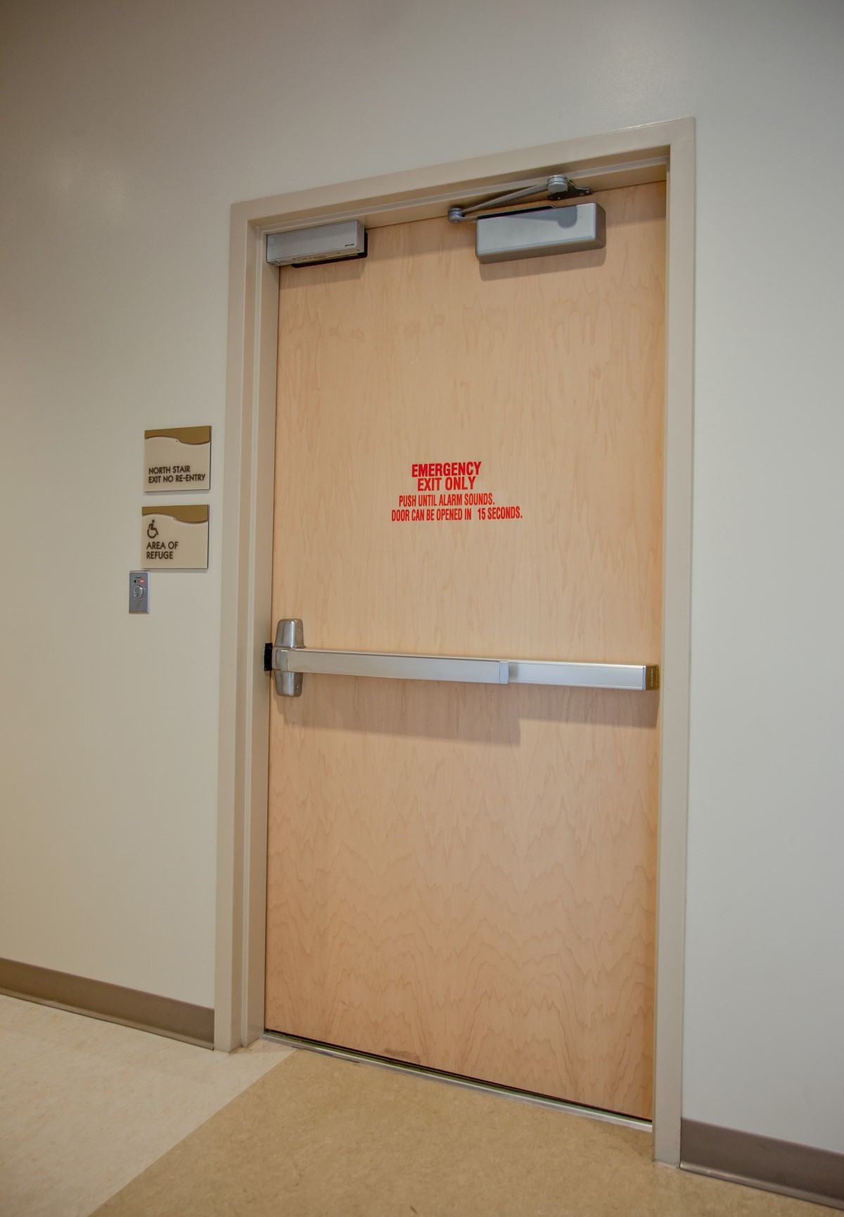 Note that the 2022 editions limits the mechanical fasteners to metal signs, and the 2025 edition does not. In addition, the 2025 edition has been changed to limit the use of fasteners to hollow metal doors and 20-minute wood doors, while the door material was not specifically stated in the 2022 edition. Both editions clarify that the fasteners can only penetrate one side of the fire door, with the 2025 edition limiting the length of the fastener to ½ inch. Adhesive must be used for applications that do not meet the criteria above, although the 2025 edition clarifies that a door manufacturer’s listings may allow another method of attachment.