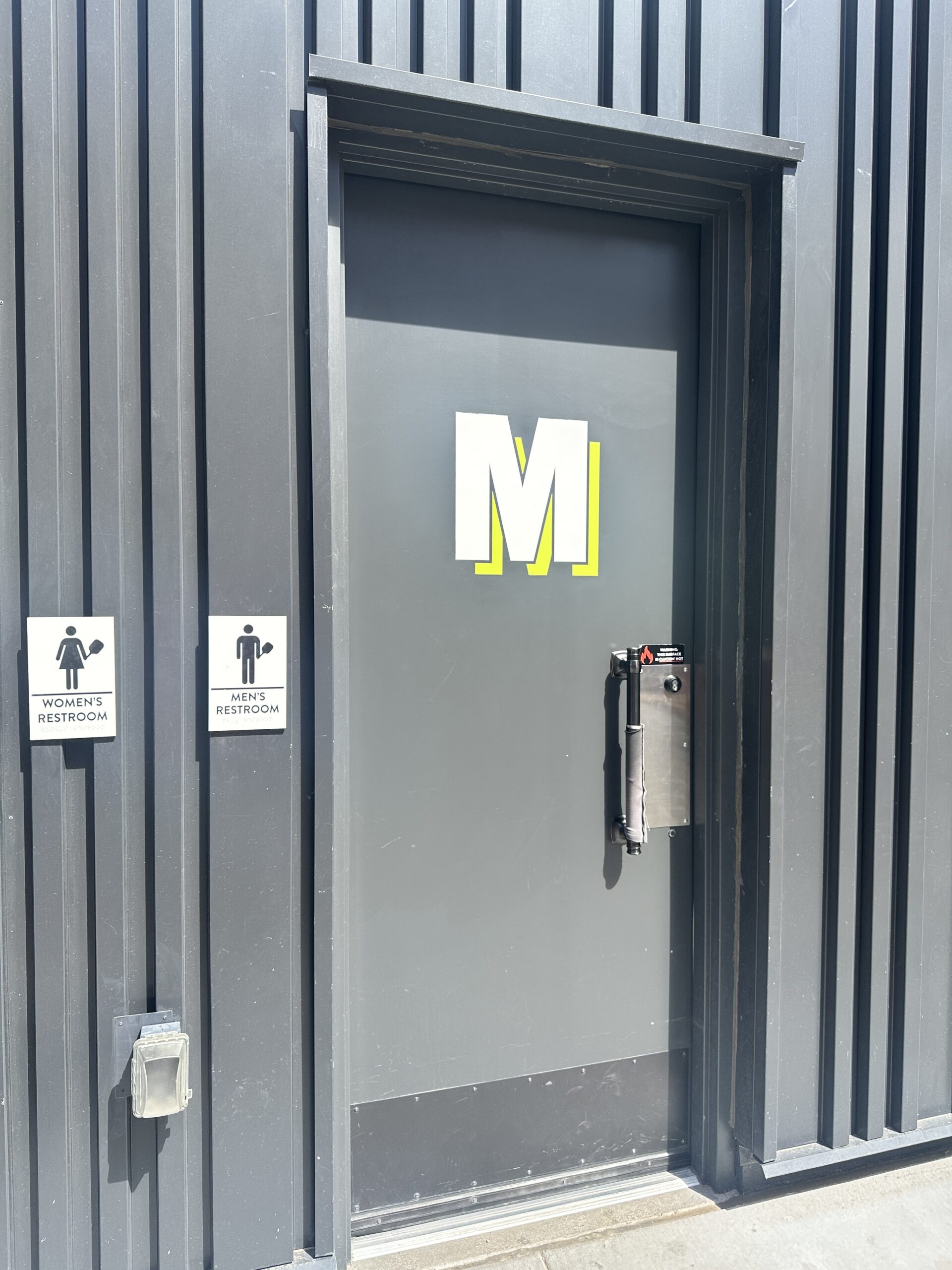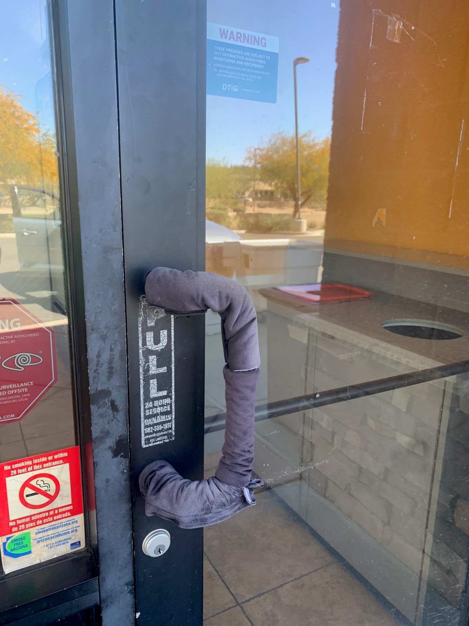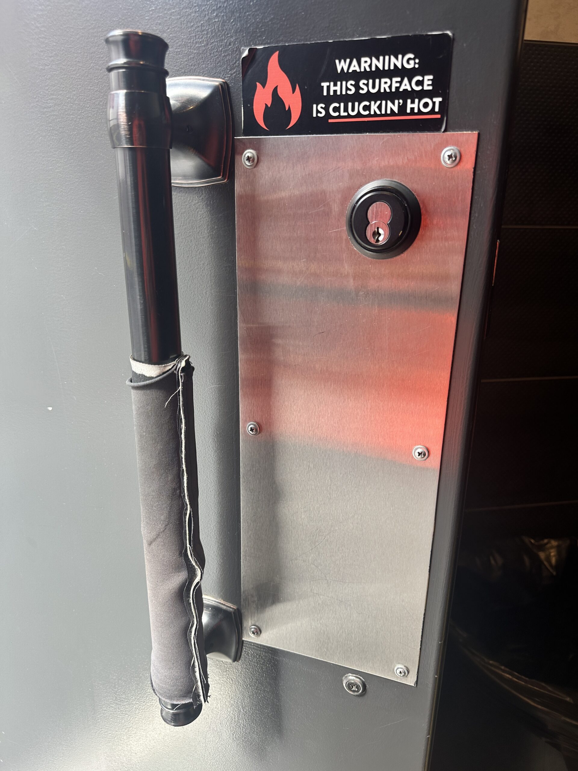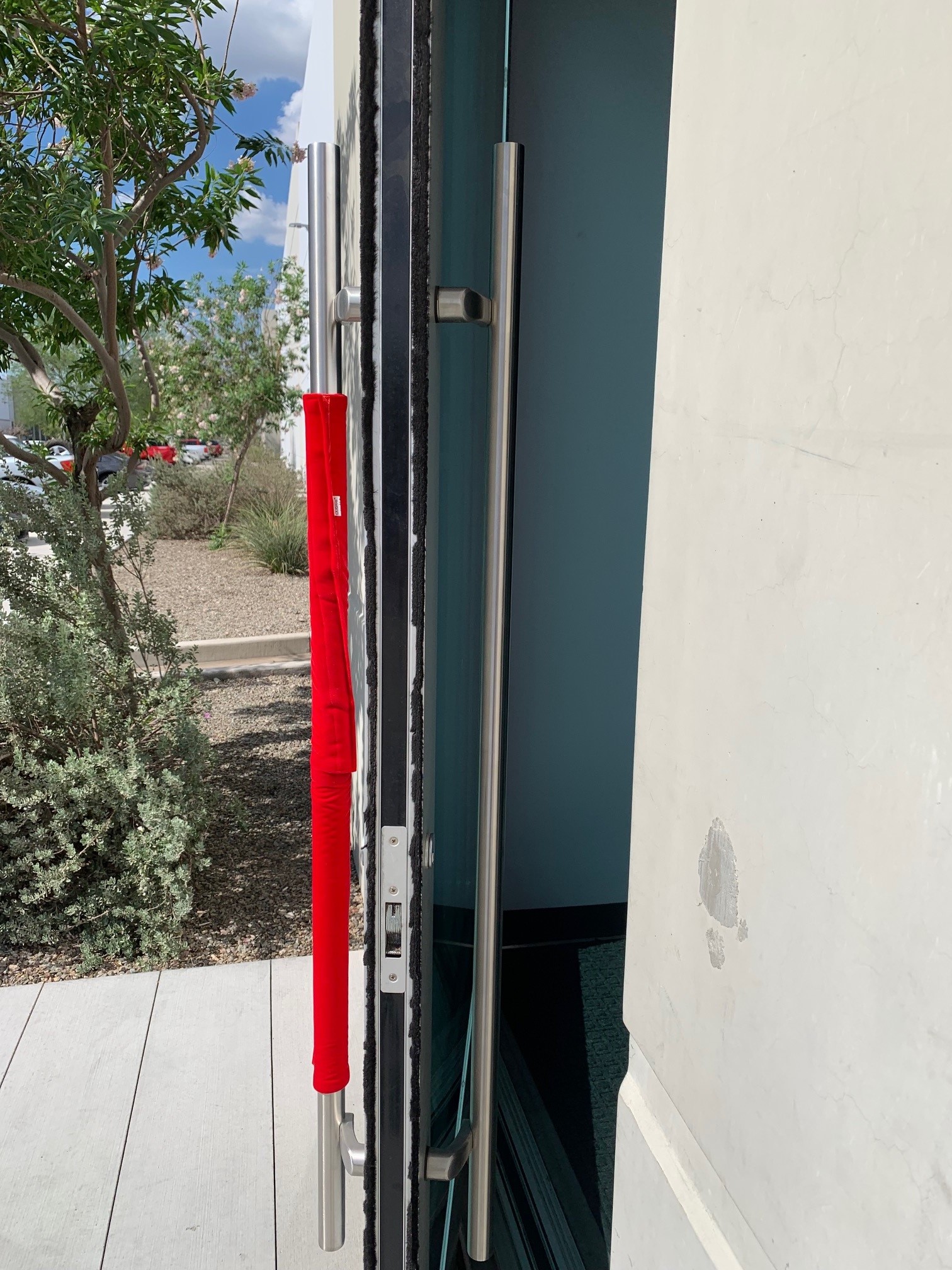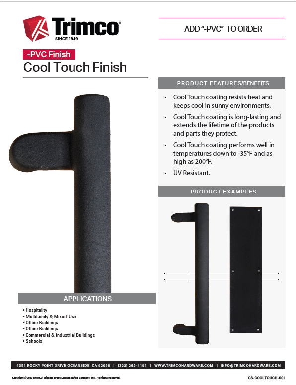 I’ve shared Fixed-it Friday photos in the past showing the creative methods used to avoid touching a door pull, lever handle, or panic hardware touchpad that has been heated by the sun (here’s one at Kungfu Noodle and another at the Hoover Dam). But TBH I didn’t know that Trimco offers a finish that can reduce the surface temperature of a door pull or push plate. It’s called the Cool Touch Finish, and to order it you just specify “-PVC as a suffix to the product number. I love these problem-solvers!